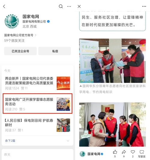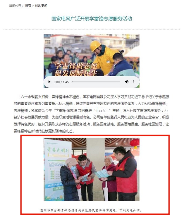 3月7日,国家电网微信公众号和公司主页要闻栏目先后发布了《国家电网广泛开展学雷锋志愿服务活动》集合稿,分部“青春光明行”志愿服务图文入选刊登,现转载如下。
