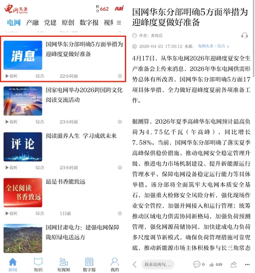 4月23日,电网头条客户端发布了《国网华东分部明确5方面举措为迎峰度夏做好准备》新闻稿,现全文转载如下。